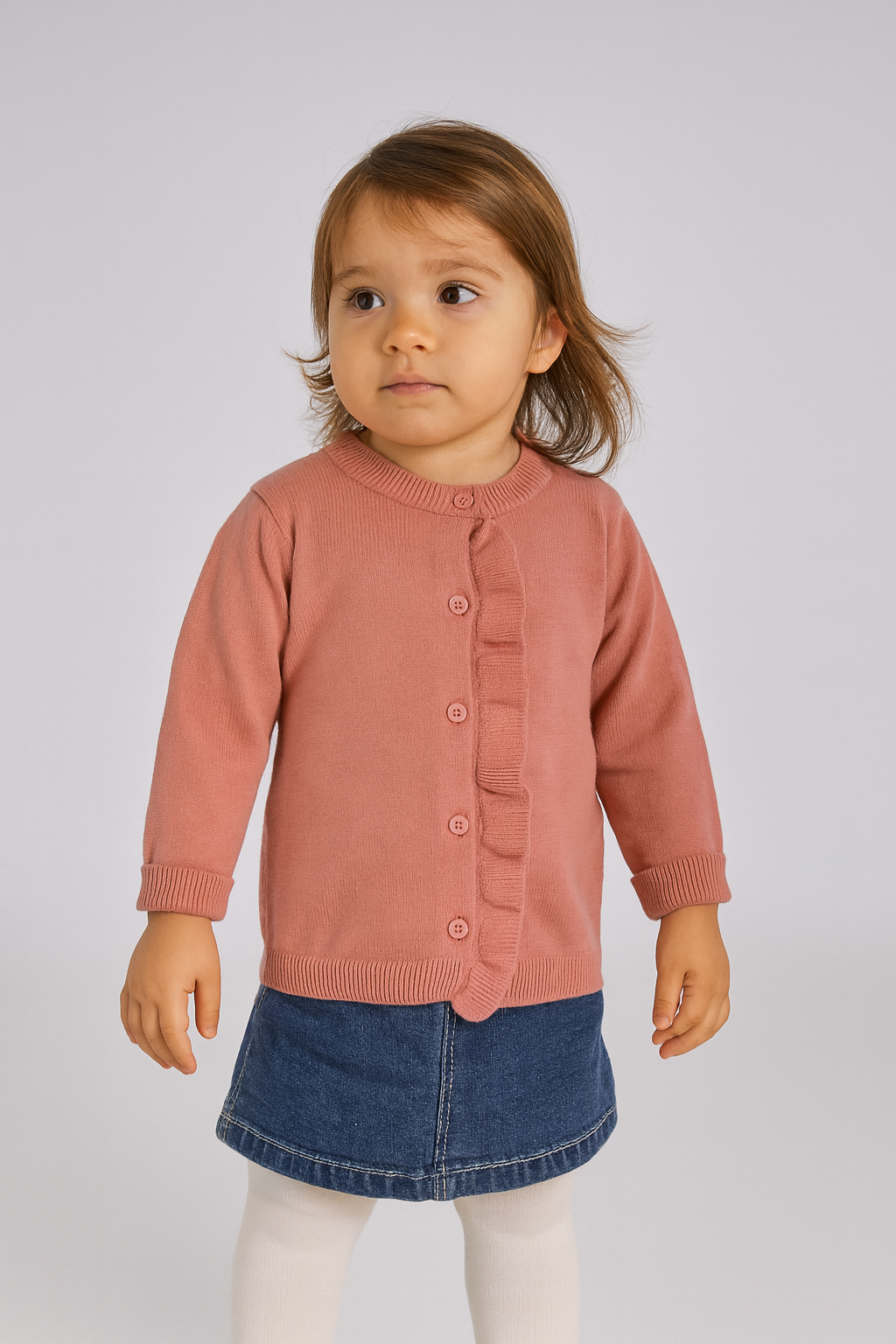 Sevimli kız bebekler için tasarlanmış bu fırfırlı uzun kollu triko hırka, hem şıklığı hem de konforu bir araya getiriyor. Yumuşak dokusu sayesinde bebeğinizin hassas cildine nazikçe dokunurken, sıcak tutma özelliğiyle soğuk günlerin vazgeçilmezi olacak.